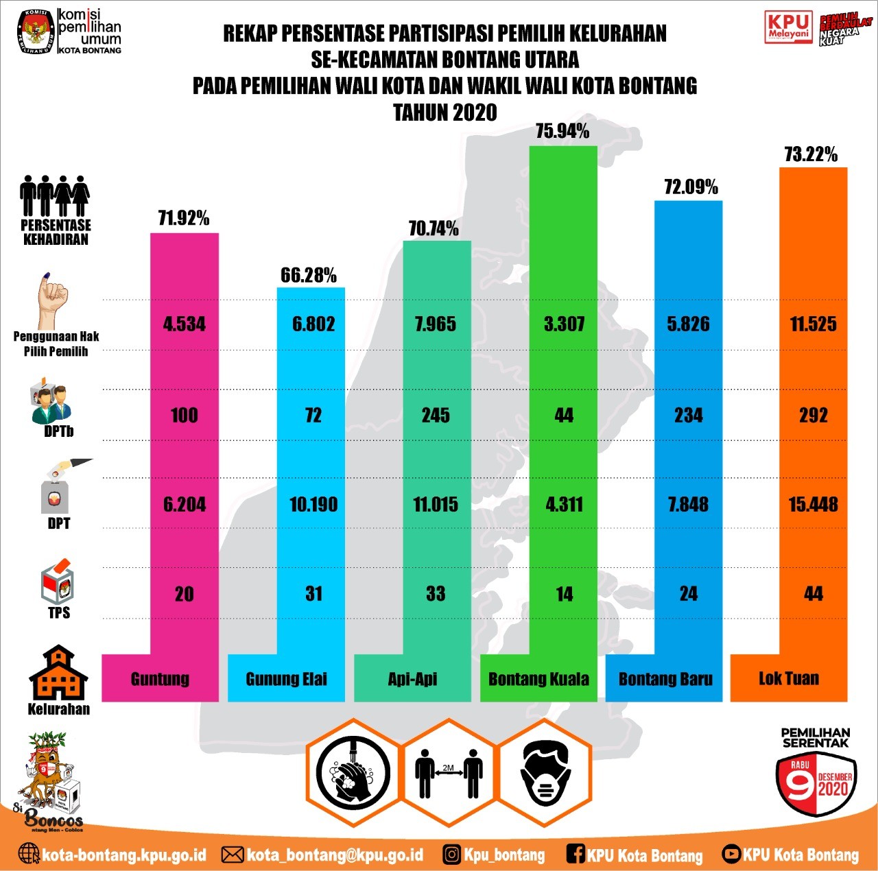 Pandemi Covid-19 nampaknya tidak menjadi halangan bagi masyarakat untuk tetap menggunakan hak pilihnya pada Pilkada Kota Bontang tahun 2020 yang lalu. Buktinya, angka partisipasi masyarakat mengalami kenaikan yang cukup signifikan dibanding Pilkada sebelumnya. Pada Pilkada Kota Bontang tahun 2015 angka partisipasi masyarakat sebesar 64,38%, dengan target nasional sebesar 77,5%. Sedangkan pada Pilkada Kota Bontang tahun 2020, angka partisipasi masyarakat mencapai 70,79%. Meski tak memenuhi target nasional yakni 77,5%, angka 70,79% menjadikan Kota Bontang sebagai kota dengan partisipasi masyarakat tertinggi ke-tiga di Kalimantan Timur. Peningkatan angka partisipasi masyarakat pada Pilkada Kota Bontang tahun 2020 yang lalu, terjadi hampir di semua wilayah kelurahan di Kota Bontang, berikut grafik yang menunjukkan persentase partisipasi masyarakat di tingkat Kelurahan se-kecamatan Bontang Utara pada Pilkada Kota Bontang tahun 2020: