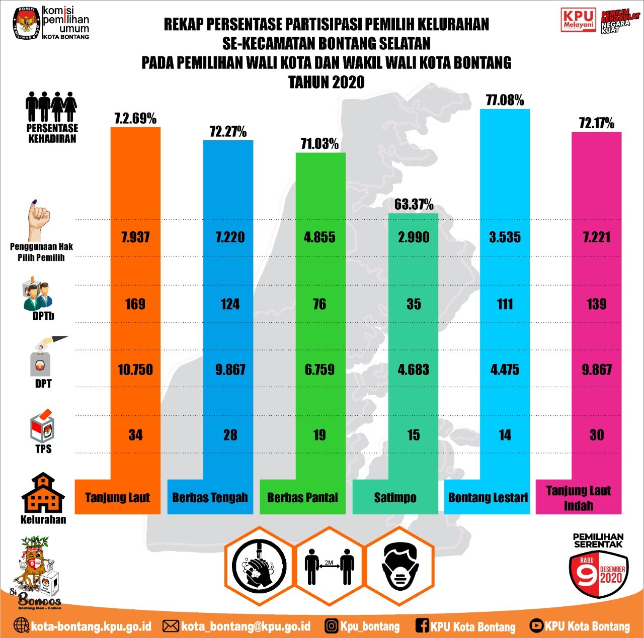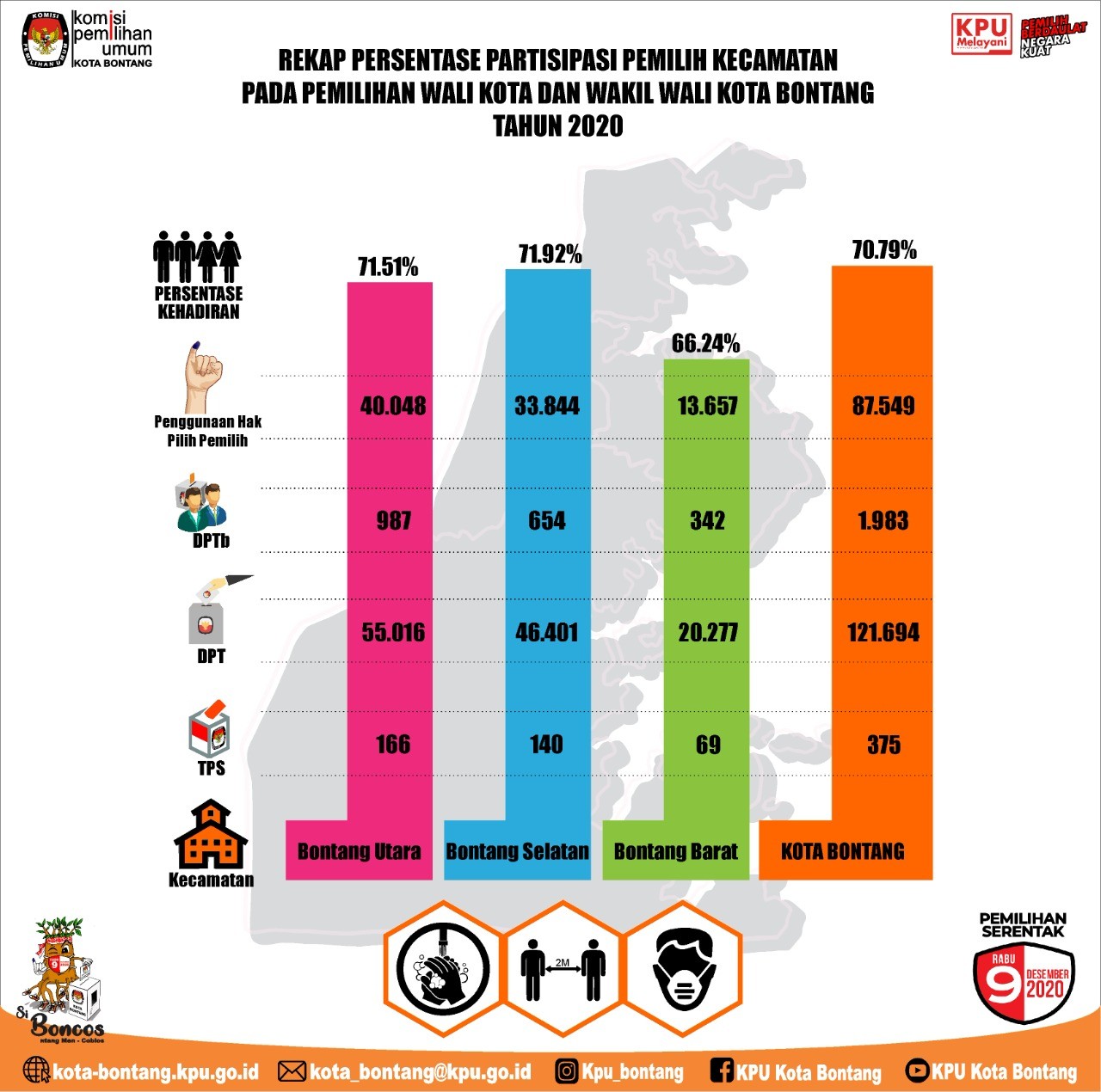 Tabel di atas menunjukkan bahwa, peningkatan angka partisipasi yang paling signifikan ada di Kelurahan Kanaan, yakni sebesar 9,75%. Sedangkan di Kelurahan Bontang Kuala, peningkatan angka partisipasi masyarakat berkisar di angka 4,88%. Dari berbagai grafik dan tabel di atas, dapat disimpulkan bahwa peningkatan angka partisipasi masyarakat dalam menggunakan hak pilihnya ke Tempat Pemungutan Suara (TPS) terjadi hampir di seluruh wilayah kelurahan se-Kota Bontang. Berikut rekap secara garis besar angka persentasi partisipasi masyarakat Kota Bontang pada Pilkada kota Bontang tahun 2020 secara garis besar di tingkat kecamatan: