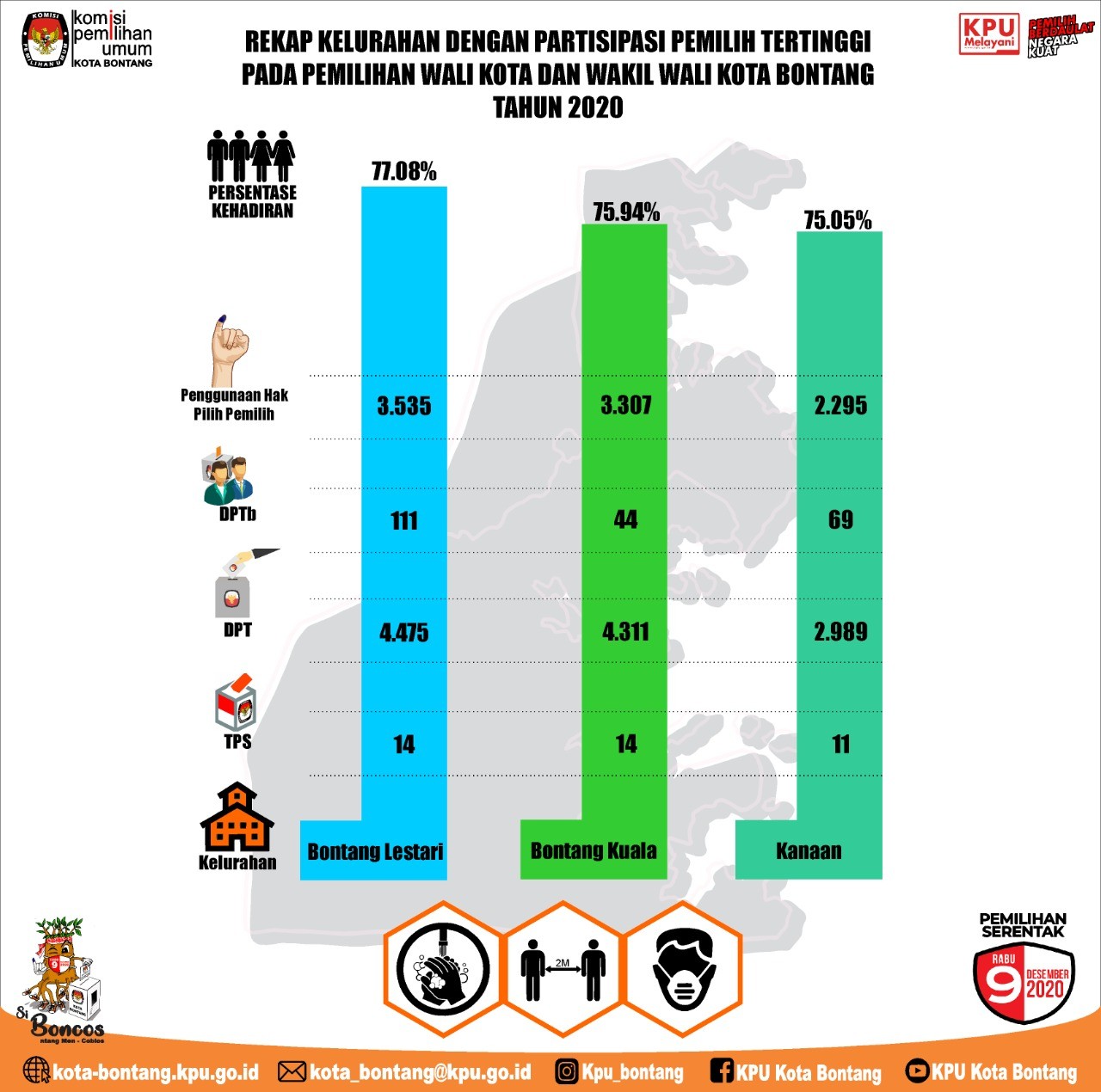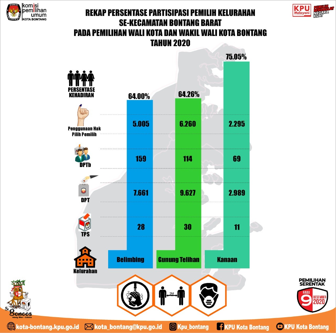 Bontang Barat menjadi Kecamatan dengan jumlah kelurahan paling sedikit, yakni tiga kelurahan. Dua dari Dari tiga kelurahan tersebut, memiliki angka partisipasi masyarakat yang tidak terlalu tinggi, hanya berkisar di angka 60%. Pertama, Kelurahan Belimbing dengan persentase partisipasi masyarakat sebesar 64%, kemudian Kelurahan Gunung Telihan sebesar 64,26%. Akan tetapi, Kelurahan Kanaan menjadi salah satu kelurahan dengan angka partisipasi masyarakat tertinggi pada Pilkada Kota Bontang tahun 2020. Tingkat persentase partisipasi masyarakat di kelurahan Kanaan pada Pilkada 2020 yang lalu mencapai sebesar 75,05%. Selain kelurahan Kanaan, ada dua kelurahan lainnya yang memiliki angka partisipasi tertinggi se-Kota Bontang pada Pilkada Kota Bontang tahun 2020, berikut grafiknya: