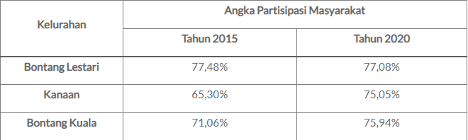 Dari grafik di atas dapat dilihat tiga Kelurahan dengan tingkat partisipasi masyarakat tertinggi pada Pilkada Kota Bontang tahun 2020. Ketiganya adalah kelurahan Bontang Lestari, Kelurahan Bontang Kuala, dan Kelurahan Kanaan. Dari ketiga kelurahan tersebut, hanya kelurahan Bontang Lestari saja yang mengalami penurunan angka partisipasi masyarakat dibandingkan dengan Pilkada sebelumnya. Akan tetapi, penurunan yang terjadi tidak begitu signifikan—yakni hanya sebesar 0,4%. Sedangkan ke-dua kelurahan lainnya mengalami peningkatan angka partisipasi yang cukup signifikan, tabel berikut akan menunjukkan perbandingan angka partisipasi masyarakat pada Pilkada Kota Bontang tahun 2015 dan 2020:
