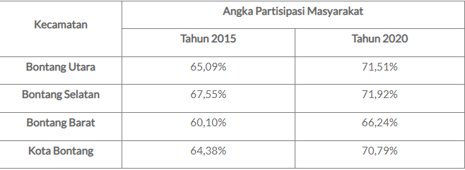 Grafik di atas menunjukkan tingginya angka partisipasi masyarakat pada Pilkada Bontang tahun 2020 yang lalu. Terdapat kenaikan angka partisipasi yang cukup signifikan di semua kecamatan di kota Bontang, dibanding Pilkada Kota Bontang tahun 2015. Namun, dari ketiga kecamatan tersebut, peningkatan paling signifikan terjadi di kecamatan Bontang Utara, yakni sebesar 6,42%. Berikut tabel perbandingan yang menunjukkan perbedaan angka partisipasi masyarakat pada Pilkada Kota Bontang tahun 2015 dan tahun 2020: