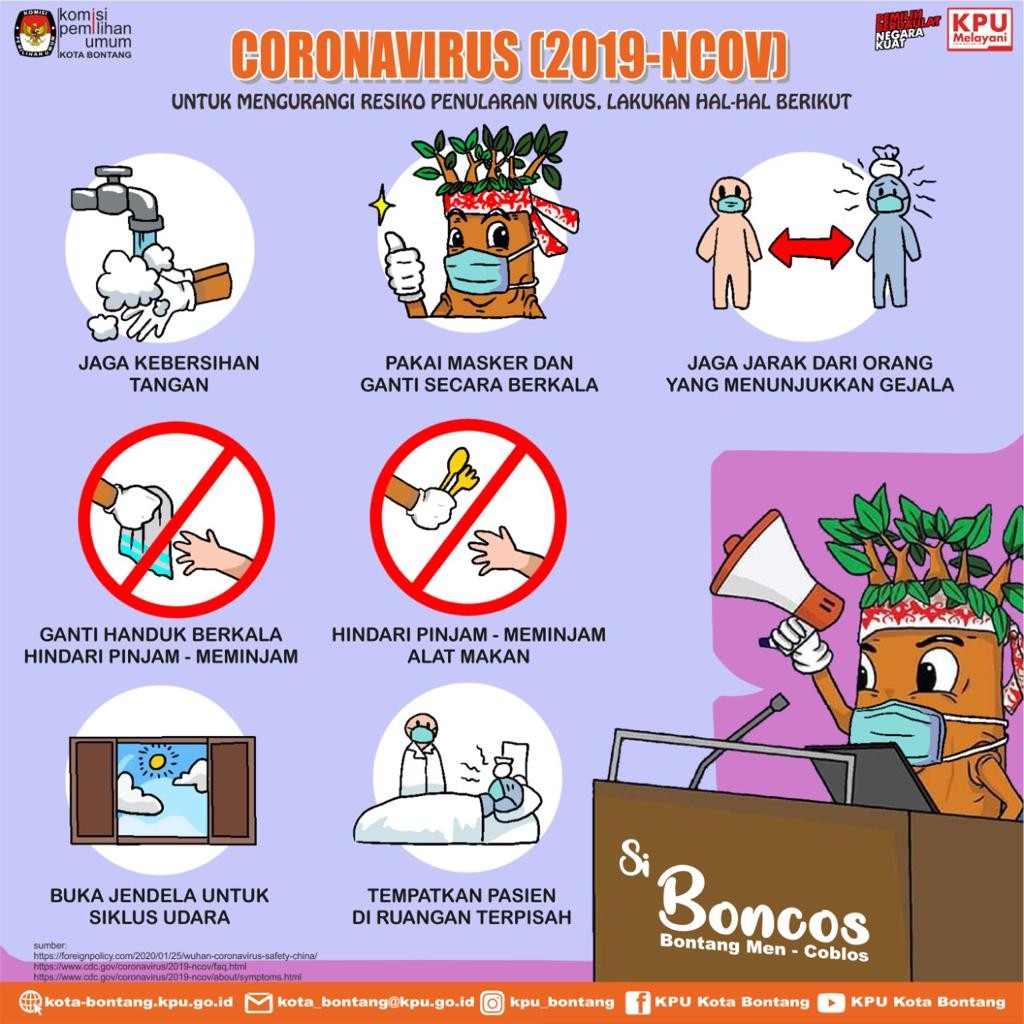 Upaya yang dilakukan KPU Kota Bontang untuk Mencegah dan Meminimalisasi Penyebaran serta Mengurangi Risiko Infeksi Corona Virus Disease (Covid-19) dengan menyusun desain dan materi yang menarik, simpel, kekinian dan edukatif dalam bentuk Infografis. Selanjutnya Sosialisasi dan Edukasi dalam bentuk Infografis tersebut diunggah melalui Facebook, Instagram dan media sosial lainnya dengan tujuan ikut menyadarkan dan memberikan pengertian kepada internal jajaran KPU Kota Bontang beserta seluruh elemen masyarakat mengenai gejala dan tindakan menghadapi covid 19 serta tips-tips yang dapat dilakukan untuk mencegah penyebaran covid 19. Dengan melakukan langkah-langkah tersebut, KPU Kota Bontang telah membantu imbauan Pemerintah Indonesia untuk Mencegah dan Meminimalisasi Penyebaran serta Mengurangi Risiko Infeksi Corona Virus Disease (Covid-19).