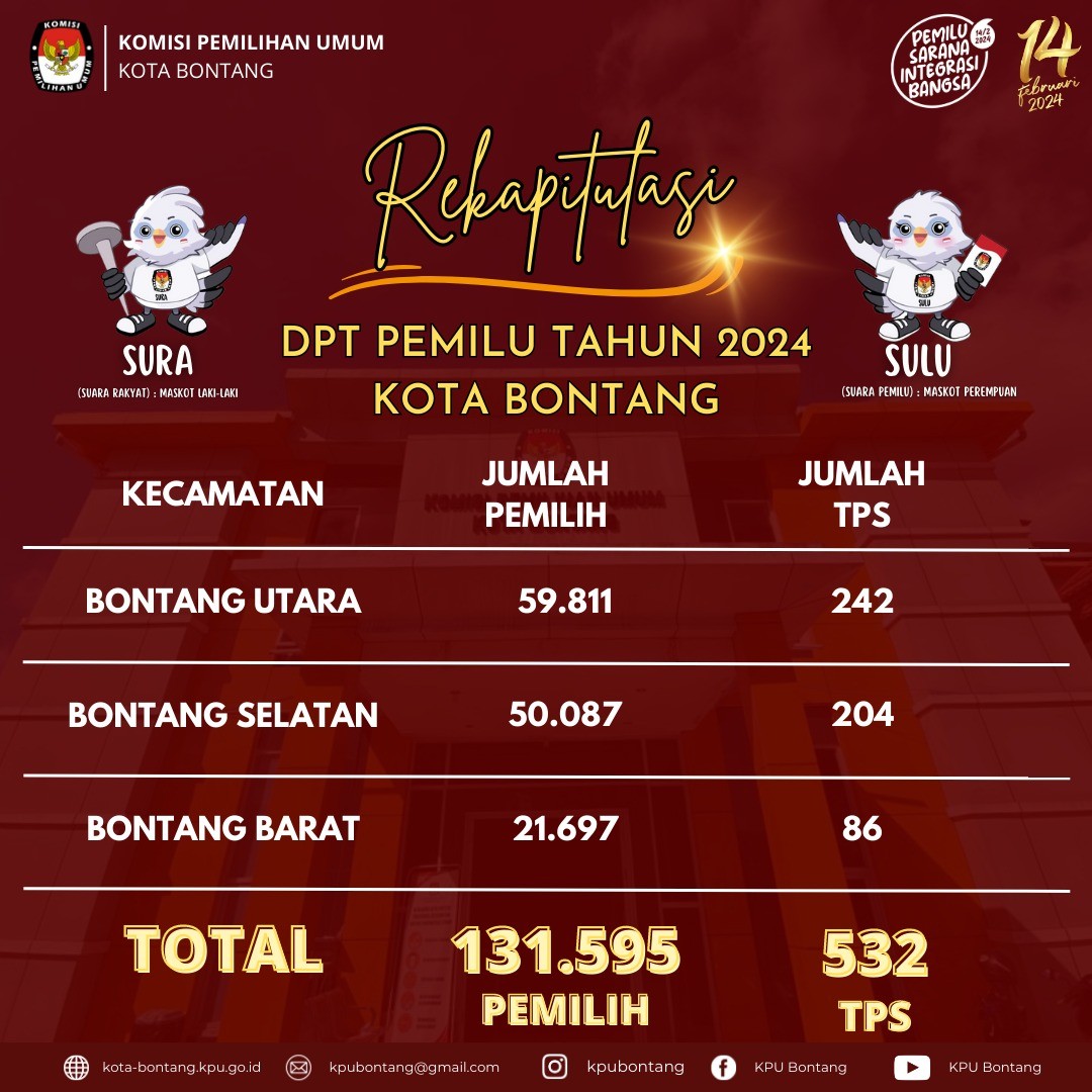 Dalam rapat pleno terbuka ditetapkan jumlah DPT Kota Bontang untuk Pemilu Tahun 2024 sebanyak 131. 595 pemilih dengan rincian sebagai berikut: