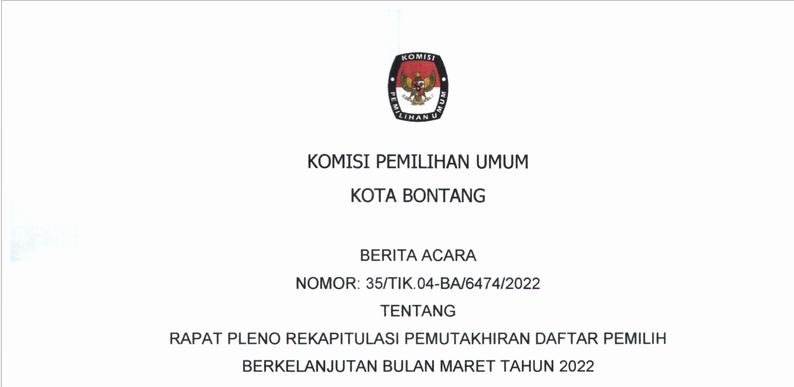 Rekapitulasi Pemutakhiran Daftar Pemilih Berkelanjutan Periode Maret Tahun 2022 Kamis, 24 Maret 2022 00:00 386 Download BA PDPB Periode Maret tahun 2022 Bagikan: Telah dilihat 386 kali
