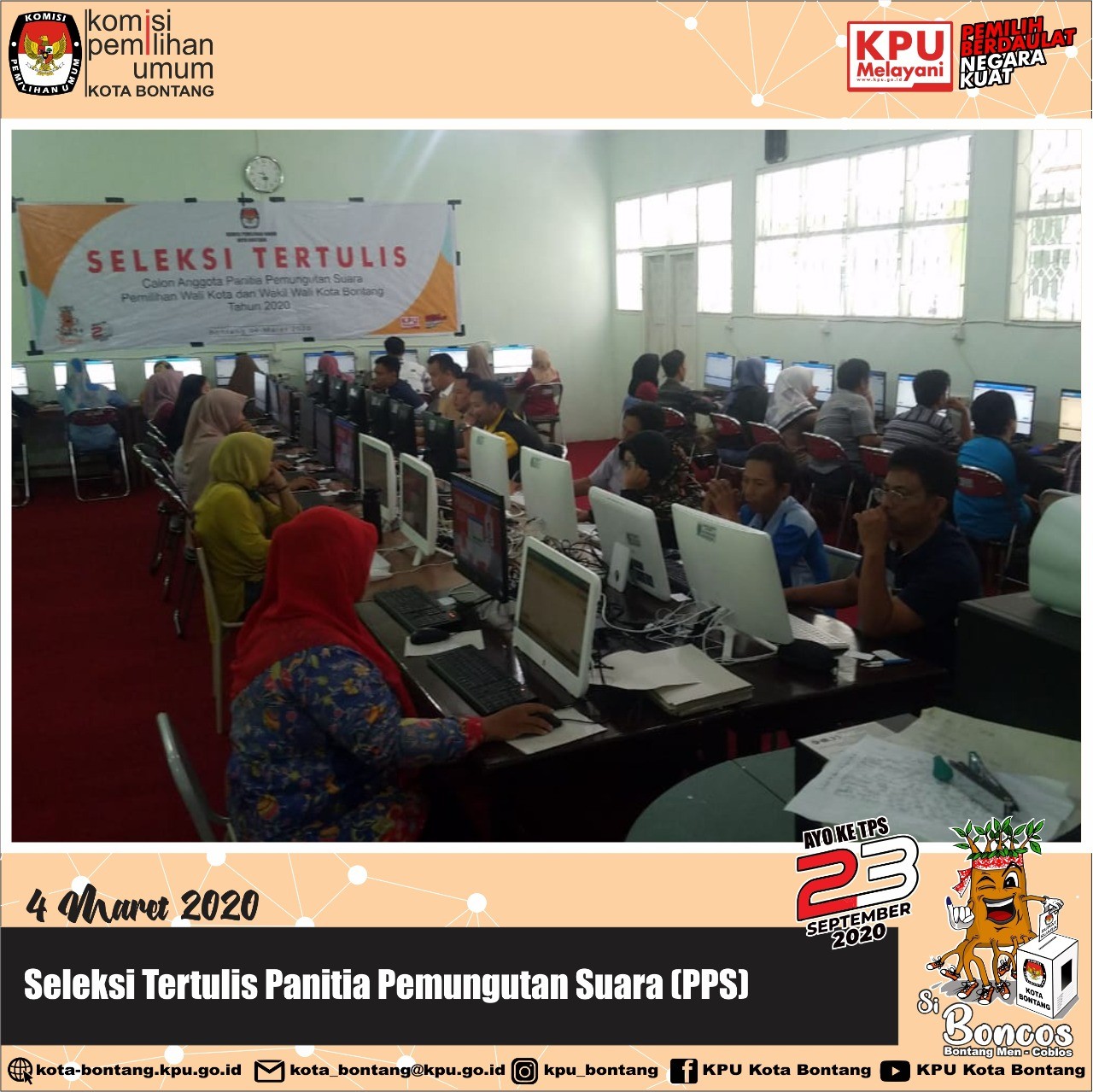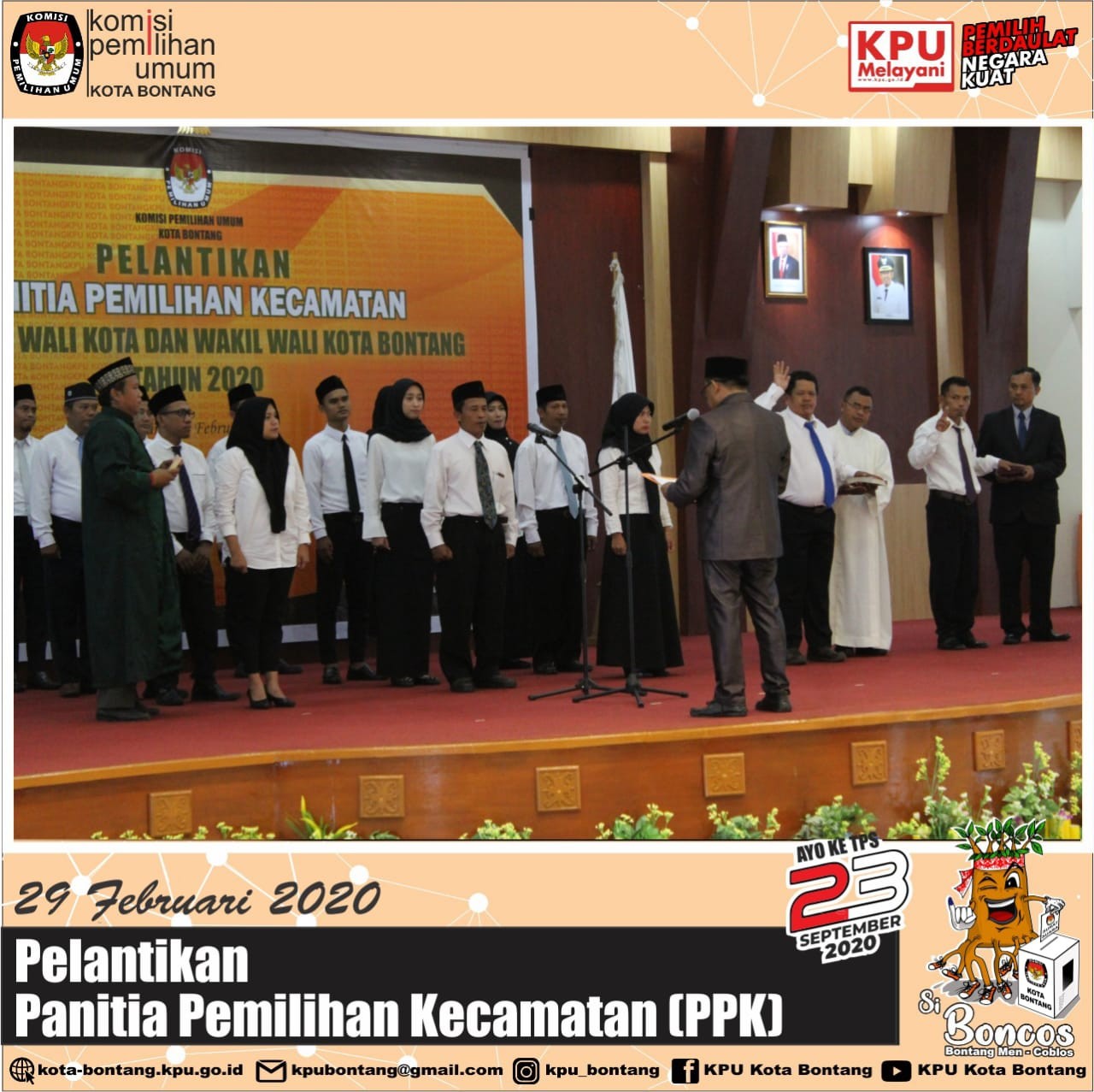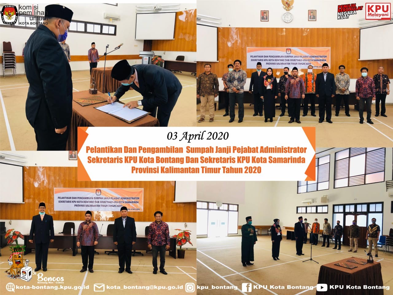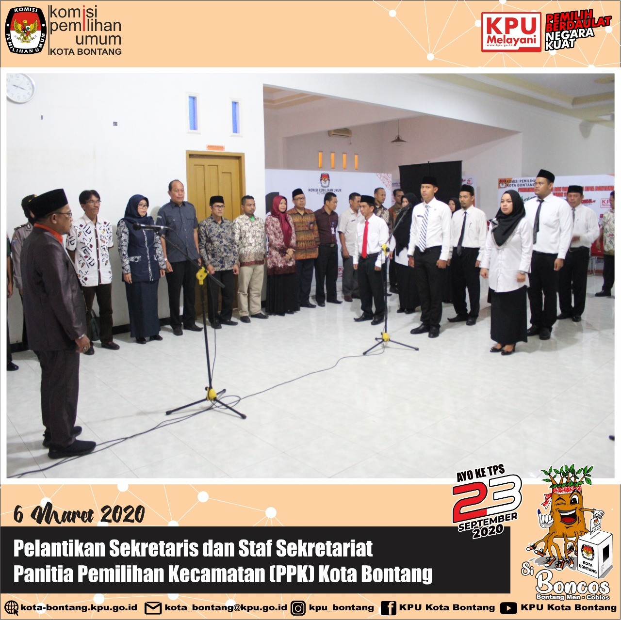 Setelah melantik 15 anggota Panitia Pemilihan Kecamatan (PPK) se-Kota Bontang, KPU Kota Bontang melaksanakan Pelantikan Sekretariat PPK untuk Pemilihan Wali Kota dan Wakil Wali Kota Bontang Tahun 2020, Kamis 6 Maret 2020 di Kantor KPU Kota Bontang. 9 orang yang dilantik, terdiri dari sekretaris, staf sekretariat urusan teknis penyelenggaraan dan staf sekretariat urusan tata usaha, keuangan, dan logistik pemilihan. Jadi, masing-masing kecamatan ada tiga orang yang bertugas di Sekretariat PPK. Acara pelantikan diawali dengan pembacaan Petikan Surat Keputusan Penunjukan Sekretaris dan Staf Sekretariat PPK oleh Plt. Sekretaris KPU Kota Bontang Ibu Falmawanty Patampang,SE . Sementara pelantikan langsung dilakukan oleh Ketua KPU Kota Bontang Bapak Erwin, ST. Ketua KPU dalam sambutannya menyampaikan selamat kepada mereka yang sudah dilantik dan berharap dapat mengemban tugas turut serta menyukseskan Pemilihan Wali Kota dan Wakil Wali Kota Bontang 23 September 2020. Pada pelantikan turut dihadiri jajaran Forum Komunikasi Pimpinan Kota Bontang, Bawaslu Kota Bontang, Instansi terkait di lingkungan Pemerintah Daerah Kota Bontang, serta PPK se-Kota Bontang.