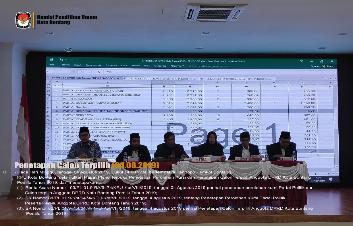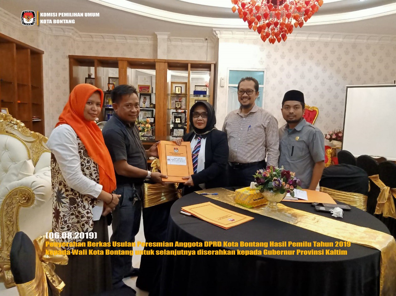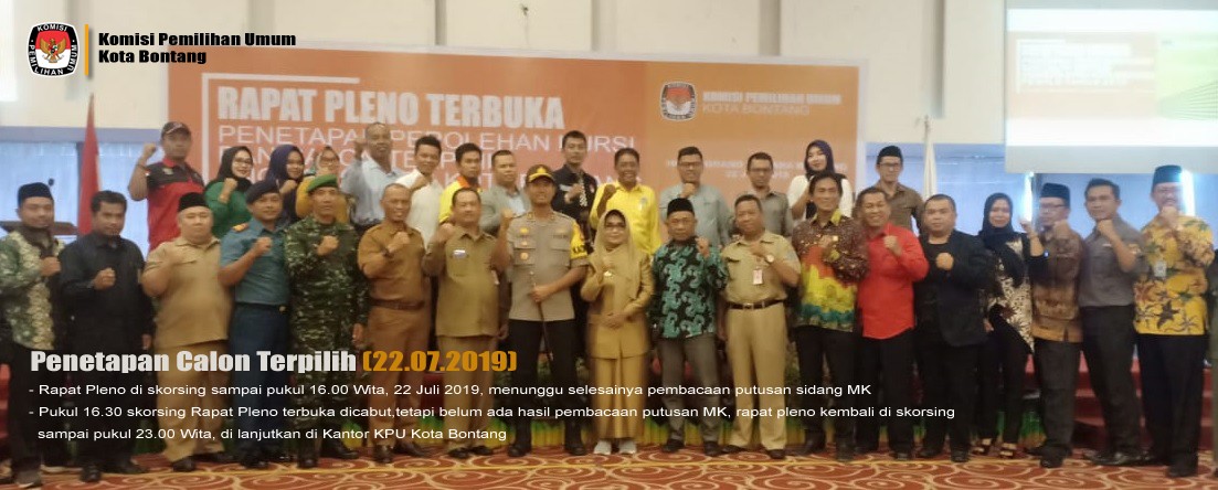 Minggu, 04 Agustus 2019, Pukul 14.00 Wita bertempat di Pendopo Rumah Jabatan Wali Kota Bontang, KPU Kota Bontang tetapkan 25 Calon Anggota DPRD Kota Bontang Terpilih Hasil PEMILU Tahun 2019 melalui Rapat Pleno Terbuka Penetapan Perolehan Kursi dan Penetapan Calon Terpilih Anggota DPRD Kota Bontang PEMILU tahun 2019, setelah melalui skorsing pada tanggal 22 Juli 2019 Pukul 16.00 Wita di Hotel Grand Mutiara (Oak Tree) dan tanggal 22 Juli 2019 Pukul 23.00 Wita di Kantor KPU Kota Bontang dikarenakan menunggu pembacaan putusan sidang MK Perselisihan PEMILU Tahun 2019 serta intruksi KPU RI melalui KPU Provinsi KALTIM. Dalam Rapat Pleno Penetapan Perolehan Kursi dan Penetapan Calon Terpilih Anggota DPRD Kota Bontang PEMILU tahun 2019 yang dihadiri oleh Forkompimda, Instansi terkait, Bawaslu, Saksi-Saksi Partai Politik menetapkan Berita Acara Nomor 103/PL.01.9-BA/6474/KPU-Kot/VIII/2019 penetapan perolehan kursi Partai Politik dan Calon Terpilih Anggota DPRD Kota Bontang, SK Nomor 81/PL.01.9-Kpt/6474/KPU-Kot/VIII/2019 penetapan Perolehan Kursi Partai Politik Peserta Pemilu Anggota DPRD Kota Bontang , SK Nomor 82/PL.01.9-Kpt/6474/KPU-Kot/VIII/2019 Penetapan Calon Terpilih Anggota DPRD Kota Bontang, Selanjutnya penandatanganan Berita Acara, SK dan Penyerahan Berita Acara dan Surat Keputusan kepada Saksi-Saksi Partai Politik, Bawaslu Kota Bontang, Sekretaris DPRD Kota Bontang, Kaban Kesbangpol, kegiatan berjalan dengan lancar dan diakhiri dengan foto bersama.