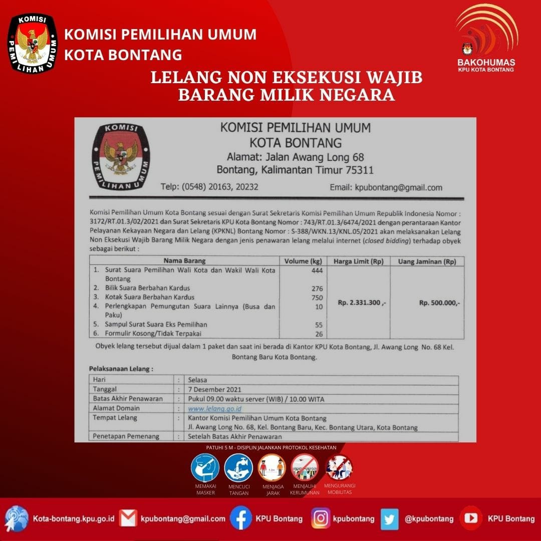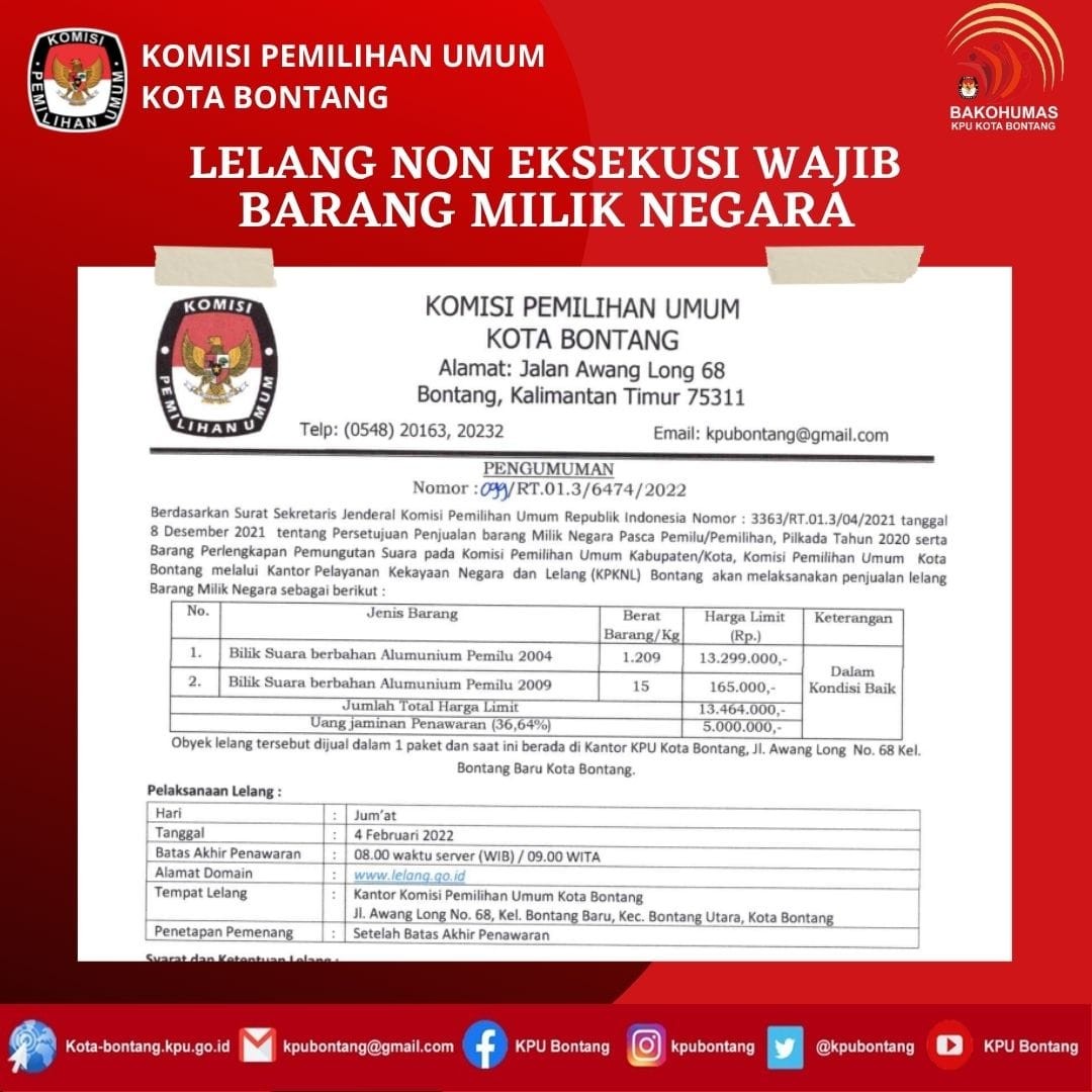 Komisi Pemilihan Umum Kota Bontang melaksanakan Lelang Non Eksekusi Wajib Barang Milik Negara berupa Bilik Pemungutan Suara Berbahan Aluminium, dengan perantaraan Kantor Pelayanan Kekayaan Negara dan Lelang Bontang.