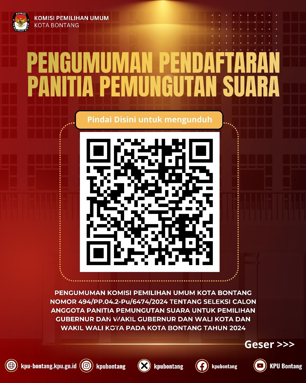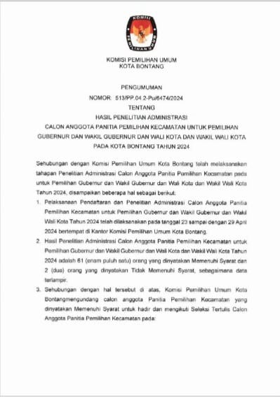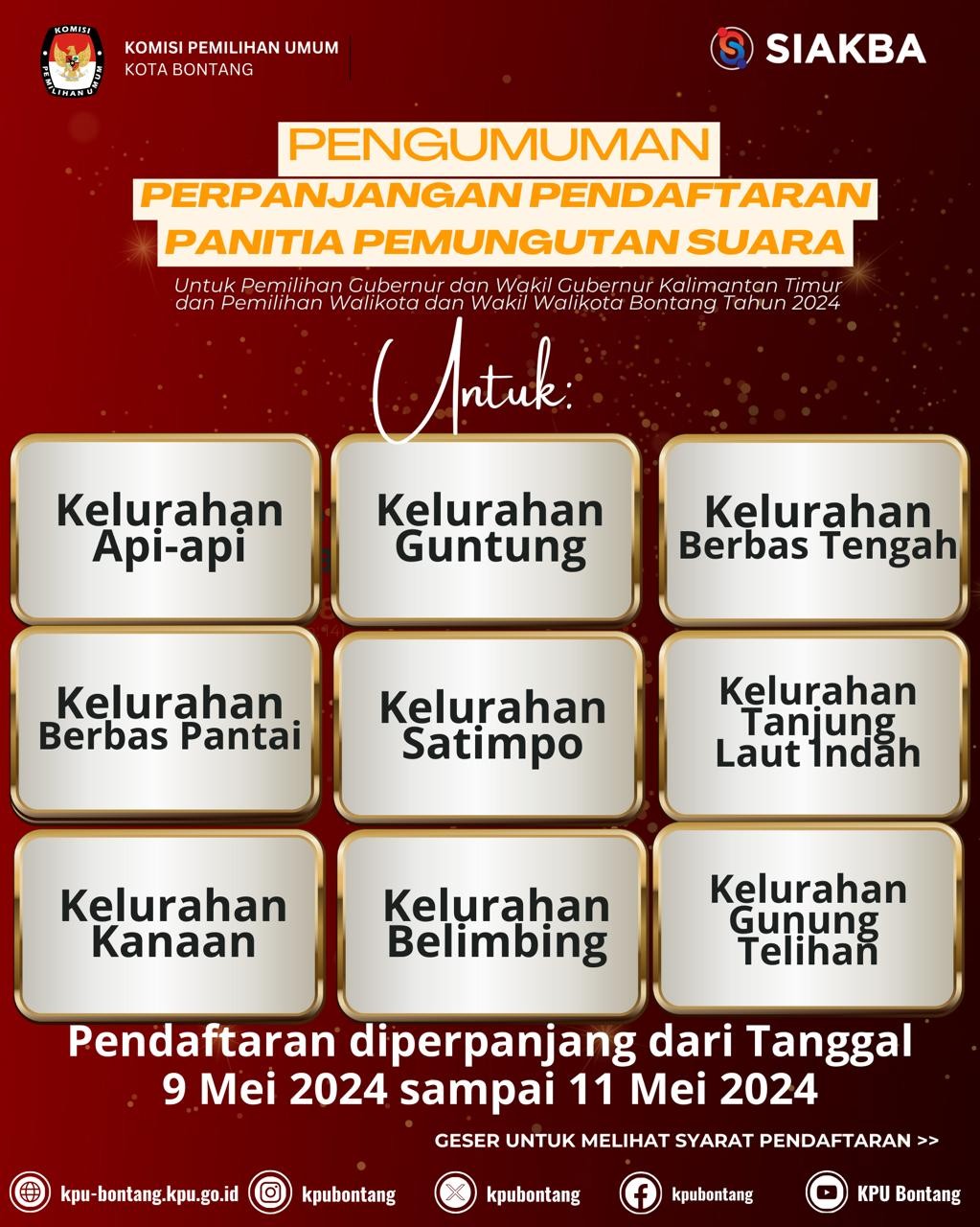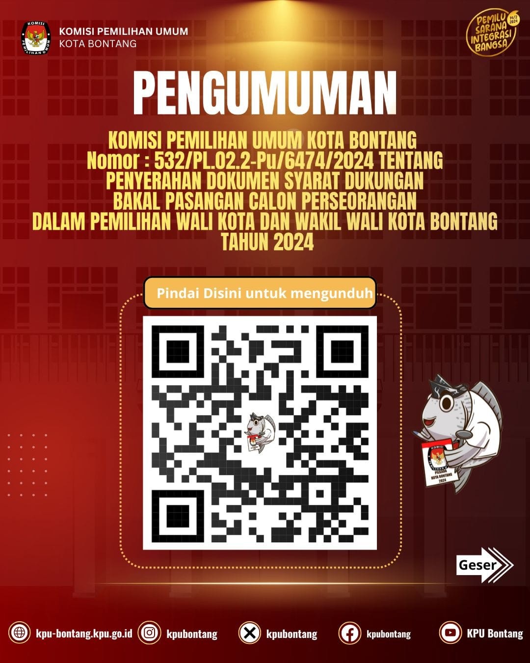 Pengumuman KPU Kota Bontang Nomor: 532/PL.02.2-Pu/6474/2024 Tentang Penyerahan Dokumen Syarat Dukungan Bakal Pasangan Calon Perseorangan Dalam Pemilihan Wali Kota dan Wakil Wali Kota Bontang Tahun 2024.